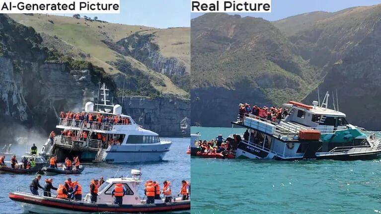 例如,一张Mount Maunganui山体滑坡的AI生成图片,看起来比真实场景要严重得多。